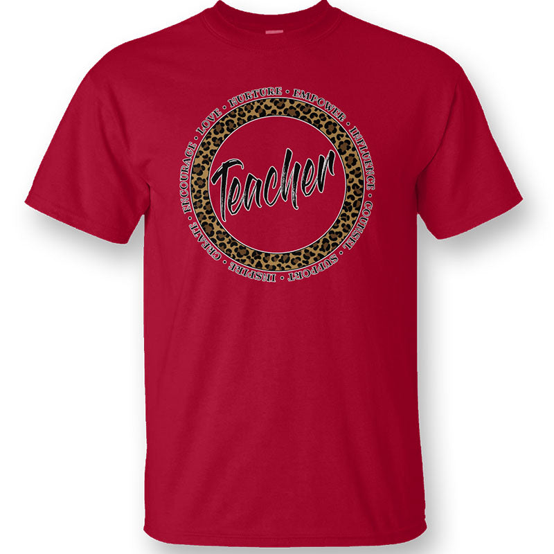All the words that describe a teacher printed on Bella Canvas red tee with leopard print accents.