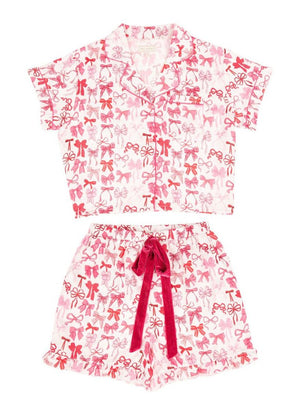 These cute bow pajamas shorts set features short sleeve button. Up tom with noted lapel and contrast piping details with front chest pocket and Simply Southern logo label, as well as ruffle hem shorts with bow drawstring and slant pockets. Made of 100% polyester.