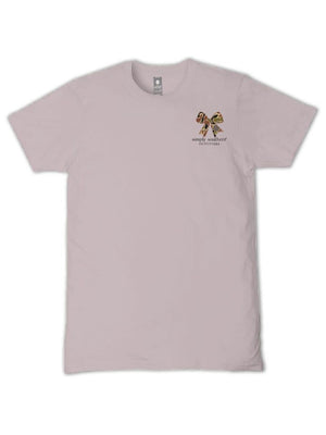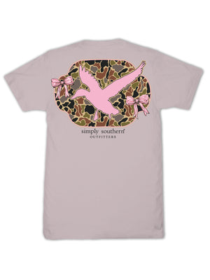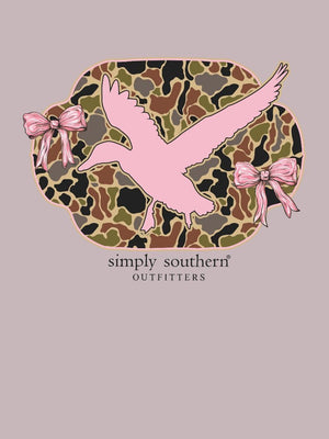 Made from 100% soft, breathable cotton, this short sleeve basic tee delivers all-day comfort in a clean, classic cut. This driftwood grey tee features a silhouetted duck center in a camo frame accented with pink bows.