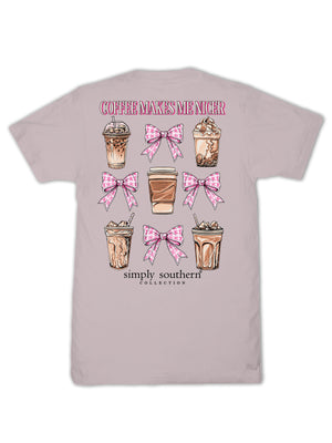 Made from 100% soft, breathable cotton, this short sleeve basic tee delivers all-day comfort in a clean, classic cut. This driftwood grey tee features a variety of coffee beverages and pink bows and the phrase 'Coffee makes me nicer'.