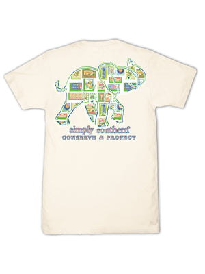 Made from 100% soft, breathable cotton, this short sleeve basic tee delivers all-day comfort in a clean, classic cut. This wisp tan tee features an elephant silhouette filled with a Mediterranean postage stamp collage and is part of our animal tracking program.