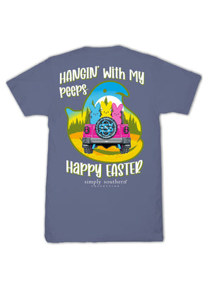Made from 100% soft, breathable cotton, this short sleeve basic tee delivers all-day comfort in a clean, classic cut. This denim blue tee features a trio of Peeps in an SUV and the phrases 'Hangin' with my Peeps' and 'Happy Easter'.