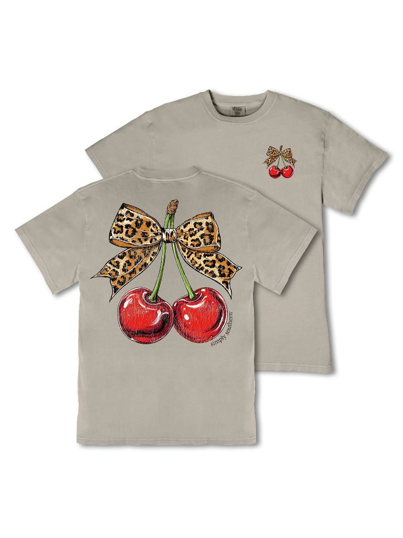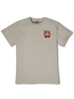 Made from 100% heavyweight cotton, this short sleeve mineral washed tee delivers structure and comfort. This birch tee features a pair of cherries topped with a leopard print ribbon.