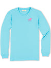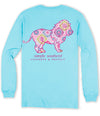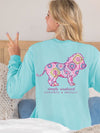 Pool blue long sleeve shirt with the phrase 'Conserve and Protect' and a lion filled with a colorful knit pattern. Simply Southern logo below and on left chest. 100% cotton. Unisex sizing. Track shirt.