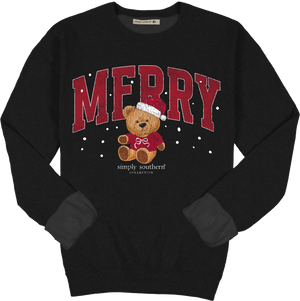 Introducing: Simply Southern's Merry Bear Holiday Crew Sweatshirt! Comfort, joy, and style all in one cozy package. Stay warm this holiday season with our festive long sleeve sweatshirt featuring a playful bear and a cheerful message. Perfect for spreading holiday cheer with a touch of quirky humor.