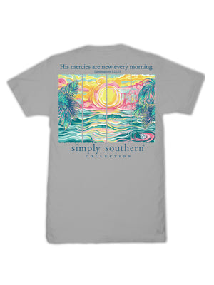 Made from 100% soft, breathable cotton, this short sleeve basic tee delivers all-day comfort in a clean, classic cut. This lunar grey tee features a painted ocean view spread across four panels and the verse 'His mercies are new every morning'.