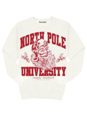 Stay cozy and festive with the Simply Southern North Pole Santa Holiday Long Sleeve Crew Sweatshirt. Featuring a playful design of Santa at the North Pole, this sweatshirt is perfect for spreading holiday cheer. Made with soft fabric and a crew neckline, it's a comfortable and stylish addition to your winter wardrobe.
