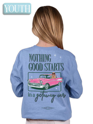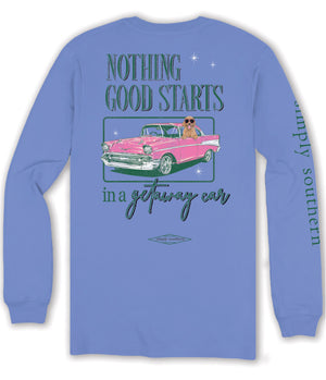 Get ready to hit the road with the Simply Southern Nothing Good Doodle Car Long Sleeve T-Shirt. This playful top features a cute getaway car design and the phrase "Nothing Good Starts in a Getaway" for a hint of humor. Perfect for any laid-back adventure, this t-shirt is sure to bring a smile to your face.