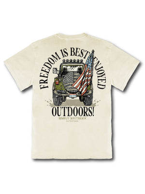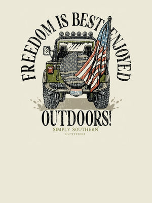 Made from 100% heavyweight cotton, this short sleeve mineral washed tee delivers structure and comfort. This bone white tee features a truck with a mounted US flag and the phrase 'Freedom is best enjoyed outdoors!'.