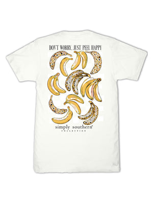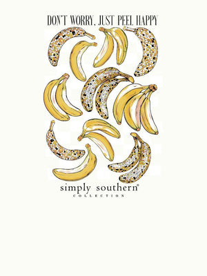 Made from 100% soft, breathable cotton, this short sleeve basic tee delivers all-day comfort in a clean, classic cut. This oyster white tee features some bejeweled bananas and the phrase 'Don't worry, just peel happy'.