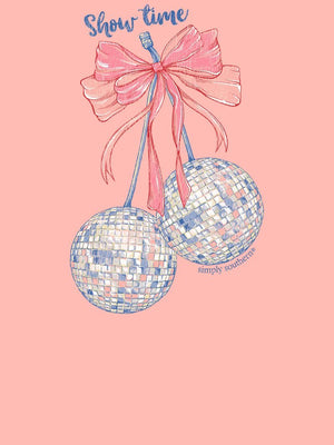 Made from 100% heavyweight cotton, this short sleeve mineral washed tee delivers structure and comfort. This light peach tee features a pair of cherries charading as disco balls and the phrase 'Show Time'.
