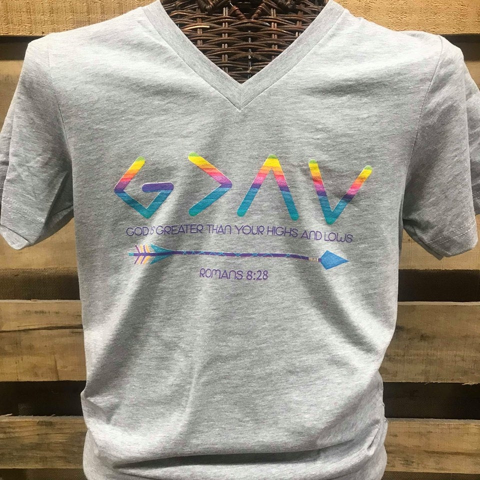 Southern Chics Apparel God's Greater then Highs & Lows V-Neck Canvas Girlie Bright T Shirt