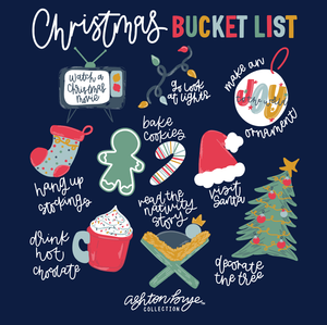 What's better than a Christmas Bucket List?! This NEW Southernology® design is from our Ashton Brye collection & encompasses all things we love about our favorite time of year. This is a front & back design printed on a short sleeve True Navy Comfort Color t-shirt and is also offered in long sleeve.