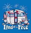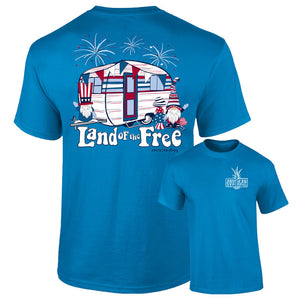 Land of the Free because of the brave! This NEW Southernology® design features a retro patriotic camper with some USA 'lovin gnomes & mushrooms. Printed on a royal caribe comfort color t-shirt.
