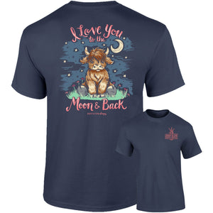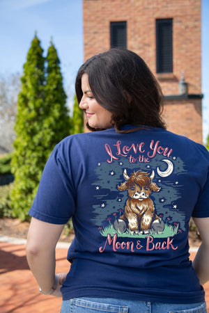 Fall in love with this new Southernology® favorite! Featuring a lovable cow and a heartfelt message to show someone your endless love. Our Moon & Back Cow tee is the perfect expression of love. Printed on a china blue Comfort Color short sleeve tee.