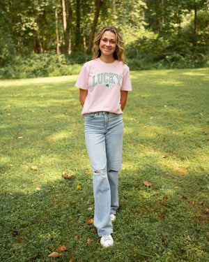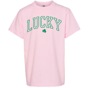 Rainbows, shamrocks, and puff letters that pop—this tee is basically your wearable pot of gold. Get ready to strike luck in style every day! Printed on a blossom Comfort Color tee.