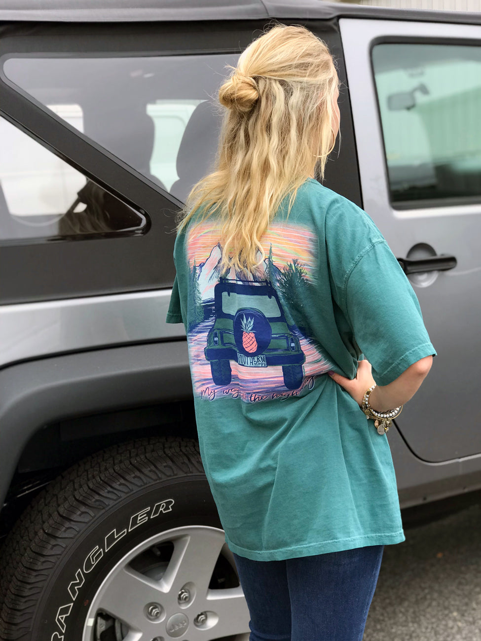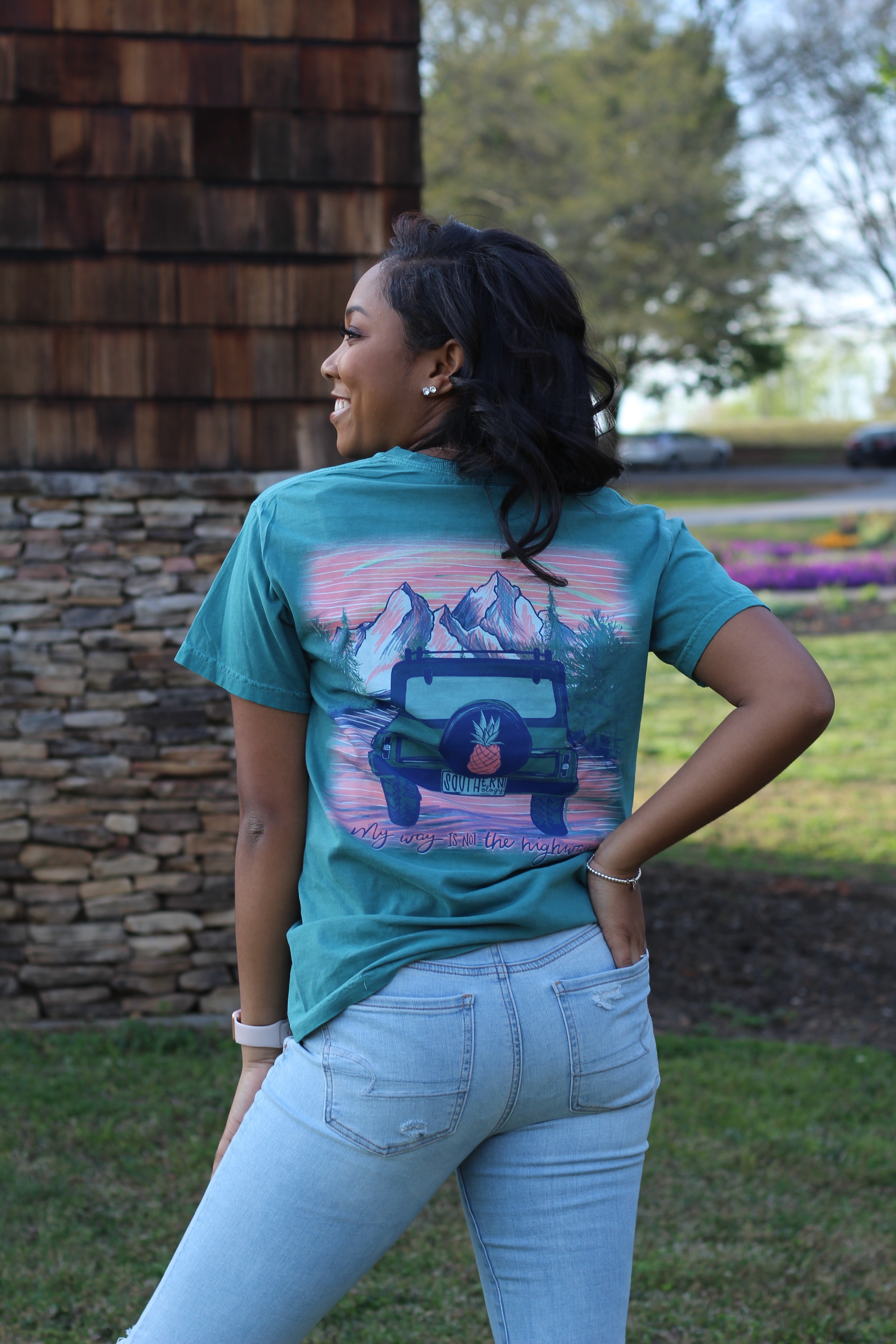 Life is a highway - and we're ready to ride it with our windows down and radio turned up! Sit back, relax, and take in the views of the Blue Ridge Mountains along a winding road in this new My Way is Not the Highway t-shirt from Southernology®! This exclusive hand-drawn design is printed on an Emerald Comfort Colors t-shirt.