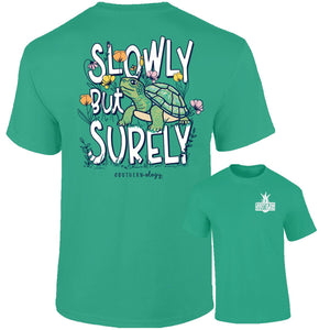 One step at a time, still moving forward. This Southernology® Slowly but Surely tee is perfect for those of us taking our time and getting there anyway because slow and steady wins the race. Printed on an island green Comfort Color short sleeve tee.