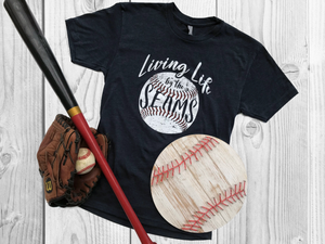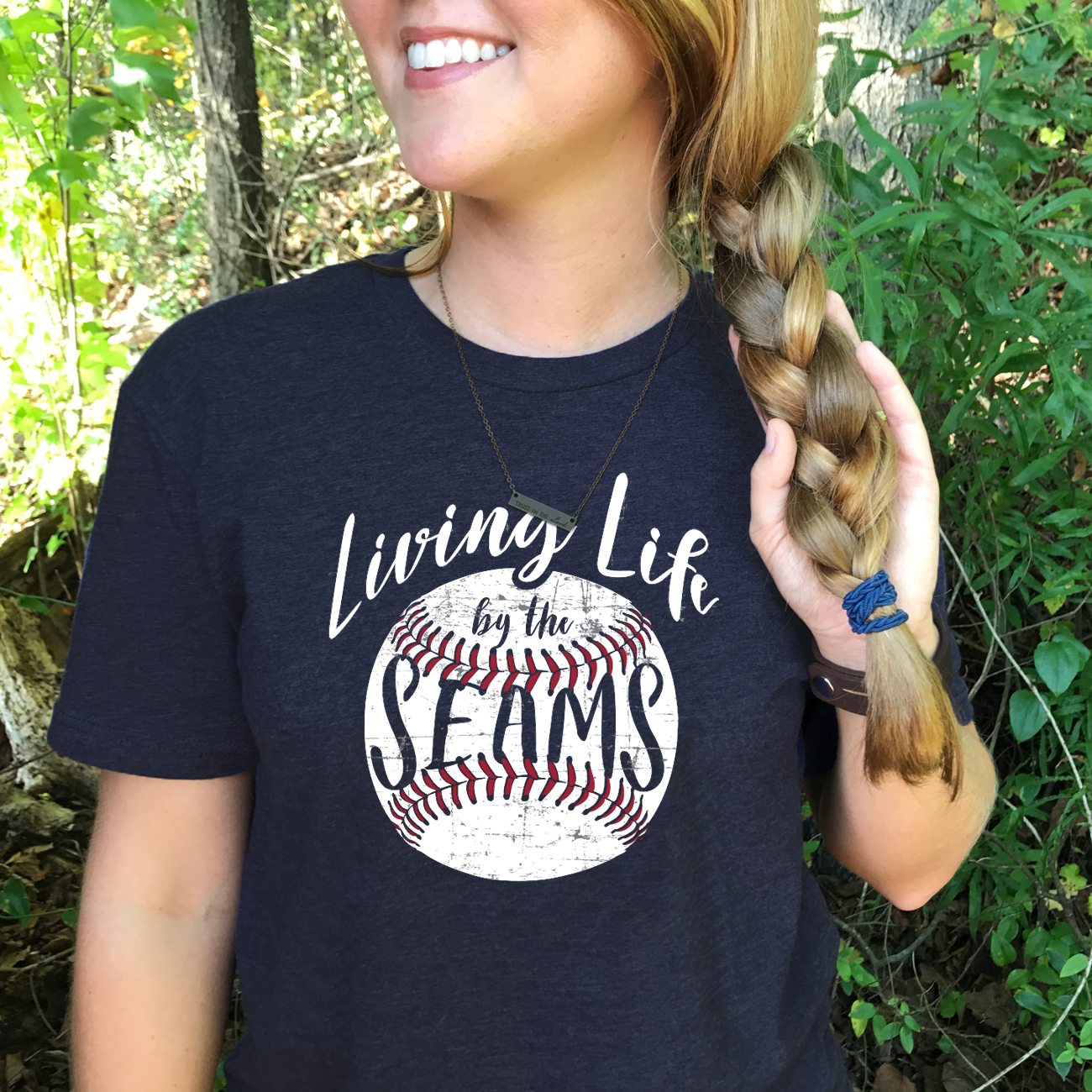 Get prepped for baseball season with this exclusive, hand-drawn design! "Living Life by the Seams" is printed in white and red ink on a Midnight Navy Next Level cotton-poly blend t-shirt.