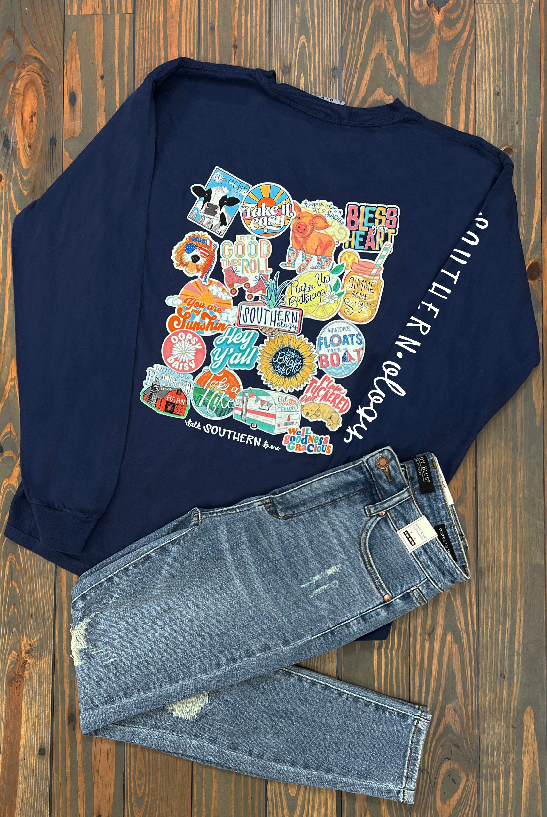 Slap a decal on it & talk southern to me! This best selling Southernology® tee features some of our favorite decals of southern sayings and is now offered in long sleeve. This design is printed on a true navy Comfort Color shirt.