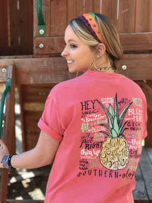 This best selling hand-drawn pineapple design is printed on a short sleeve comfort color in a vibrant Watermelon shade. From "Hey Y'all" to "Heavens to Betsy" it boasts the most Southern phrases around! The Southernology® pineapple logo is printed on the front left chest; also offered in Navy.