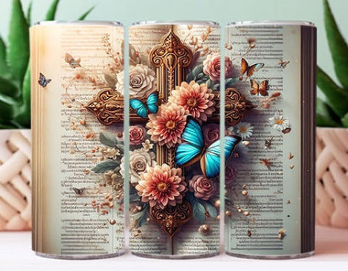 Cross, Flowers, and Butterflies 20 oz Skinny Tumbler Cup With Straw